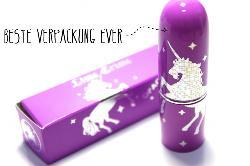 Mir gefällt die Farbe gar nicht und ich finde sie sieht auch auf den Lippen sehr komisch aus. Die Verpackung ist allerdings echt cool, das Einhorn ist ja mal total der Hammer :O