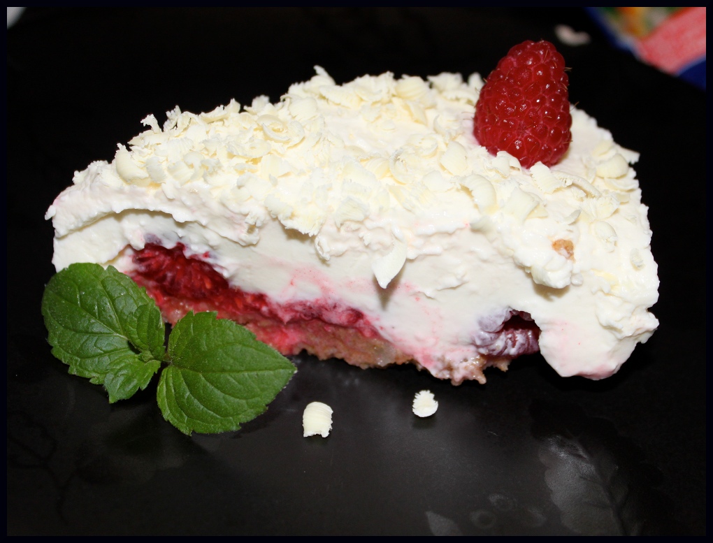 4. Kuchenform aus dem Kühlschrank holen, mit Himbeeren belegen und dann die Frischkäsecreme drüber. Mit weiteren Himbeeren ganieren. Alles in den Kühlschrank stellen, damit es fest wird 🙂